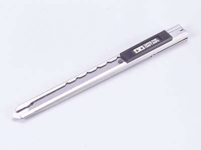 Posiada wysuwane ostrze w metalowej prowadnicy z zapadką.