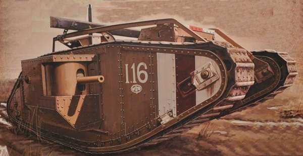 Meng brytyjski ciężki czołg Mk. V Male z okresu I wojny światowej.