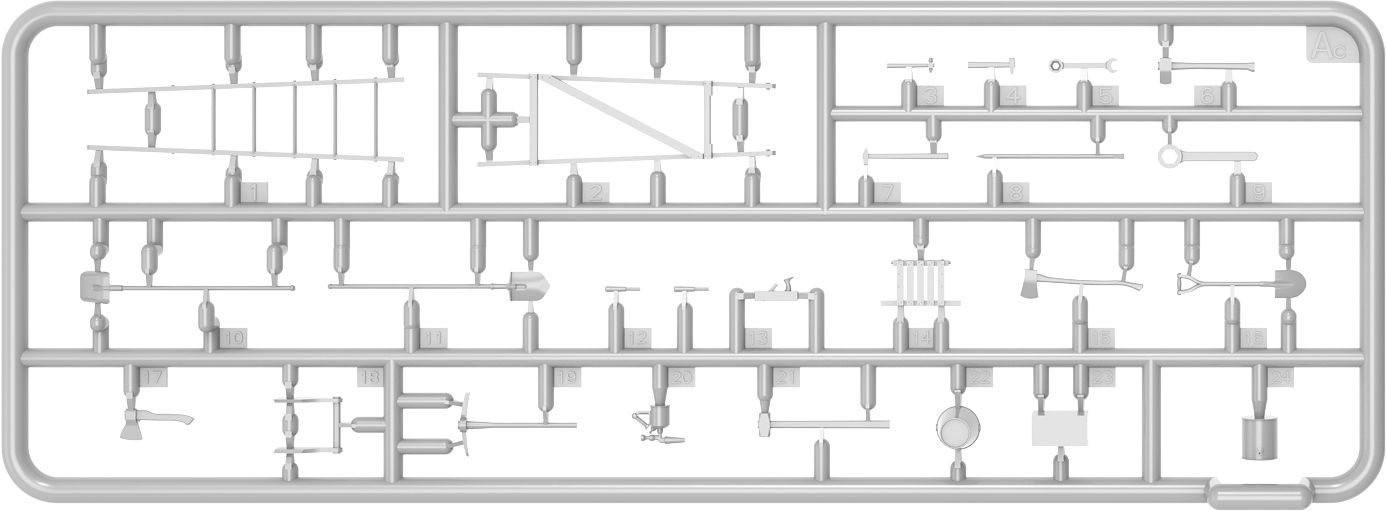 W komplecie znajdują się 4 niemieckie figurki z wyposażeniem, a w tym, narzędziami, drabiną, stołem, krzesłami, wiadrami i wieloma innymi.