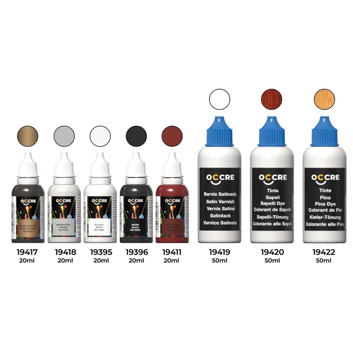 Zestaw zawiera 4 farby akrylowe, 1 podkład modelarski, 1 lakier bezbarwny satynowy oraz 2 bejce niezbędne do pomalowania modelu drewnianego Belle Poule (OcCre 15007).