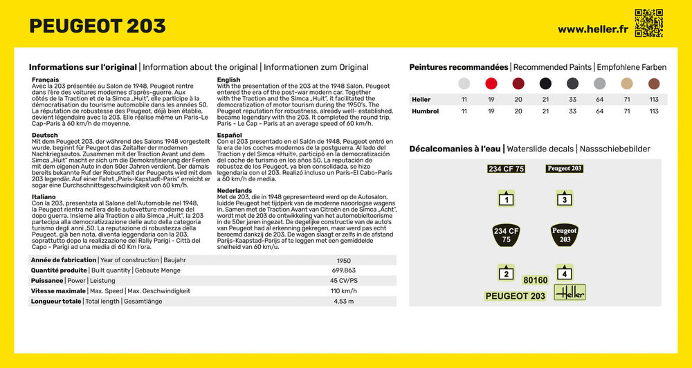 Samochód Peugeot 203 do sklejania i pomalowania z firmy Heller nr katalogowy 80160.