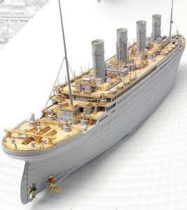 - plastikowy model do sklejania statku pasażerskiego RMS Titanic o długości 385 mm i szerokości 43 mm (wypraski kolorowe), ilość elementów: ok. 141,