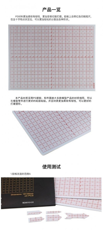 W skład tego zestawu wchodzą trzy arkusze polistyrenu, z których każdy ma wymiary 190x250mm (szerokość x długość) i grubość 0.3 mm.