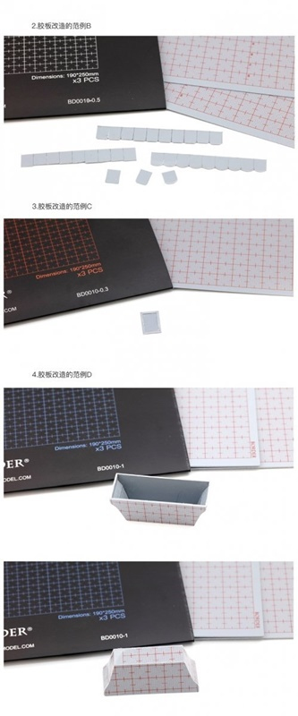 W skład tego zestawu wchodzą trzy arkusze polistyrenu, z których każdy ma wymiary 190x250mm (szerokość x długość) i grubość 0.5 mm.