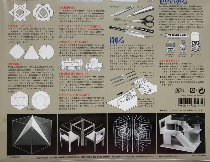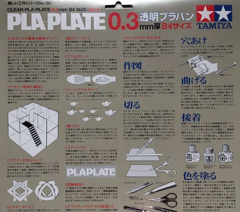 Polistyrenowe przezroczyste płyty o grubość 0,3 mm i wymiarze 364 x 257 mm (B4) do różnych projektów modelarskich i szkolnych, tworzenia dioram i makiet. Zestaw Tamiya nr 70191 zawiera 4 płyty.