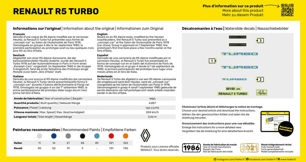 Samochód Renault R5 Turbo do sklejania i pomalowania z firmy Heller nr katalogowy 80150.