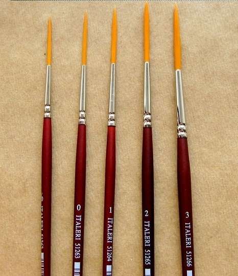 Drugie zdjęcie (zbiorcze) przedstawia różne grubości pędzli Italeri dostępnych w pozostałej ofercie.