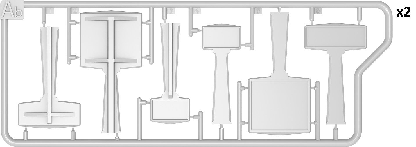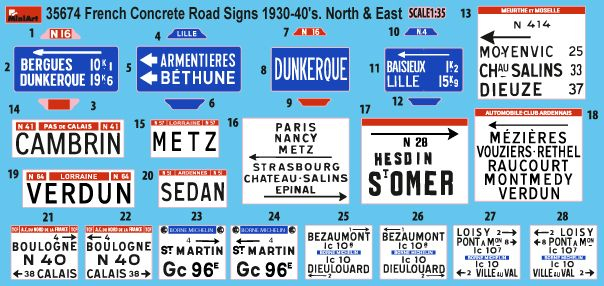 W modelu znajdują się najróżniejsze warianty betonowych znaków drogowych, które można było znaleźć w północnej i wschodniej Francji w okresie 1930-40's. Są też kalkomanie.