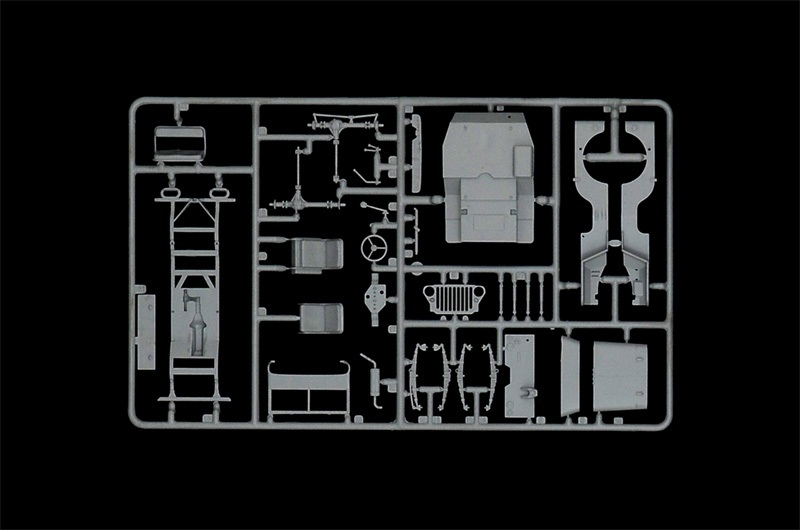 Model posiada: 2 farbki akrylowe, 1 klej modelarski do plastiku, 1 pędzelek, elementy do sklejenia modelu samochodu Jeep, 1 figurkę.